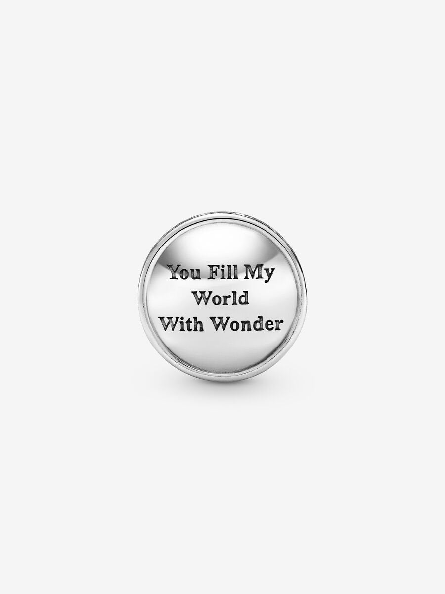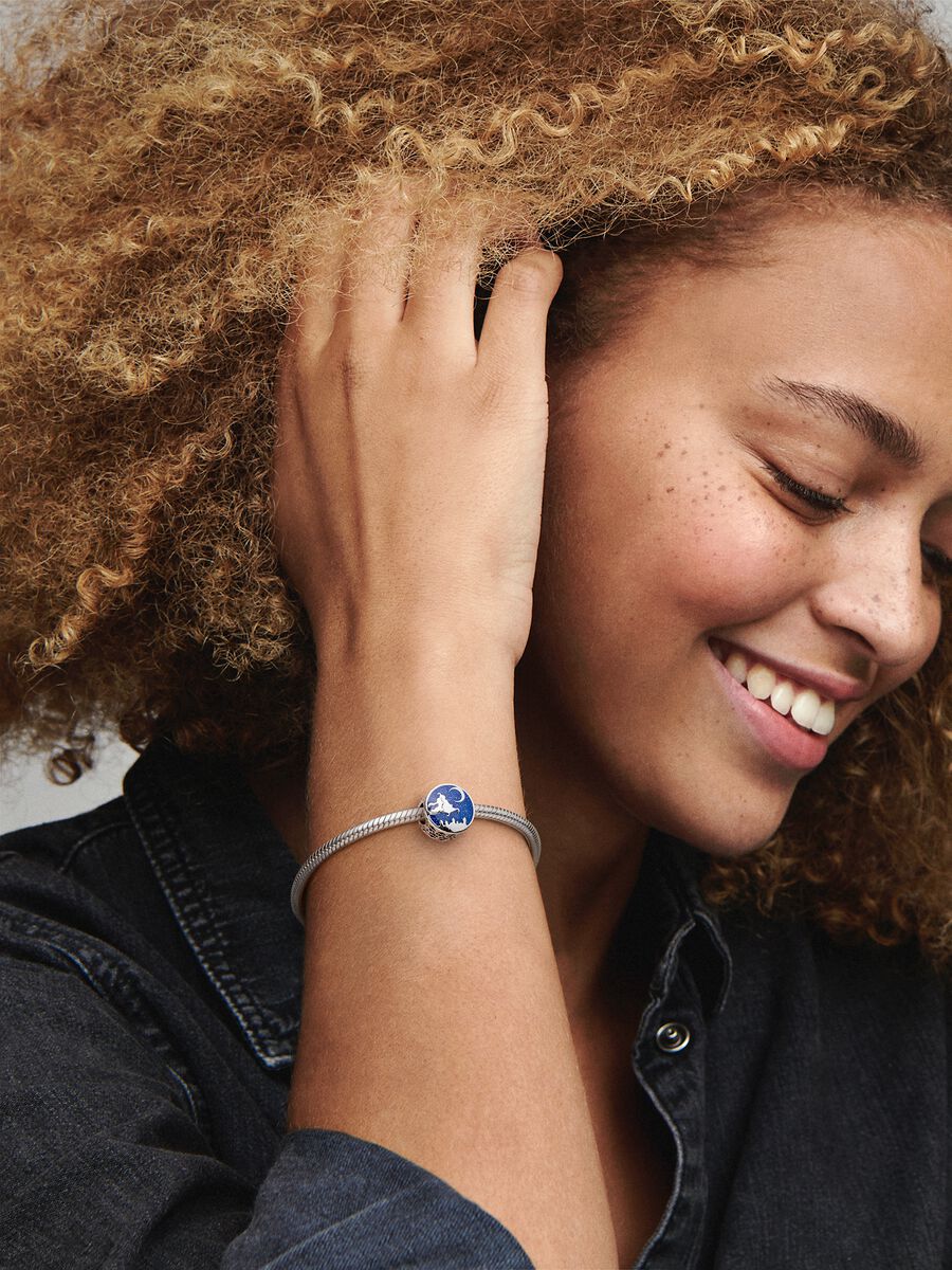 Wear a precious reminder of beautiful moments in life with this beautifully detailed sterling silver charm. A tribute to Disney's Aladdin, it features a nightscape of Aladdin and Princess Jasmine flying on amagic carpet, detailed with hand-applied enamel in an enchanting blue hue. The engraving "You Fill My World With Wonder" makes it a thoughtful gift for someone you admire. Available in-store and online.