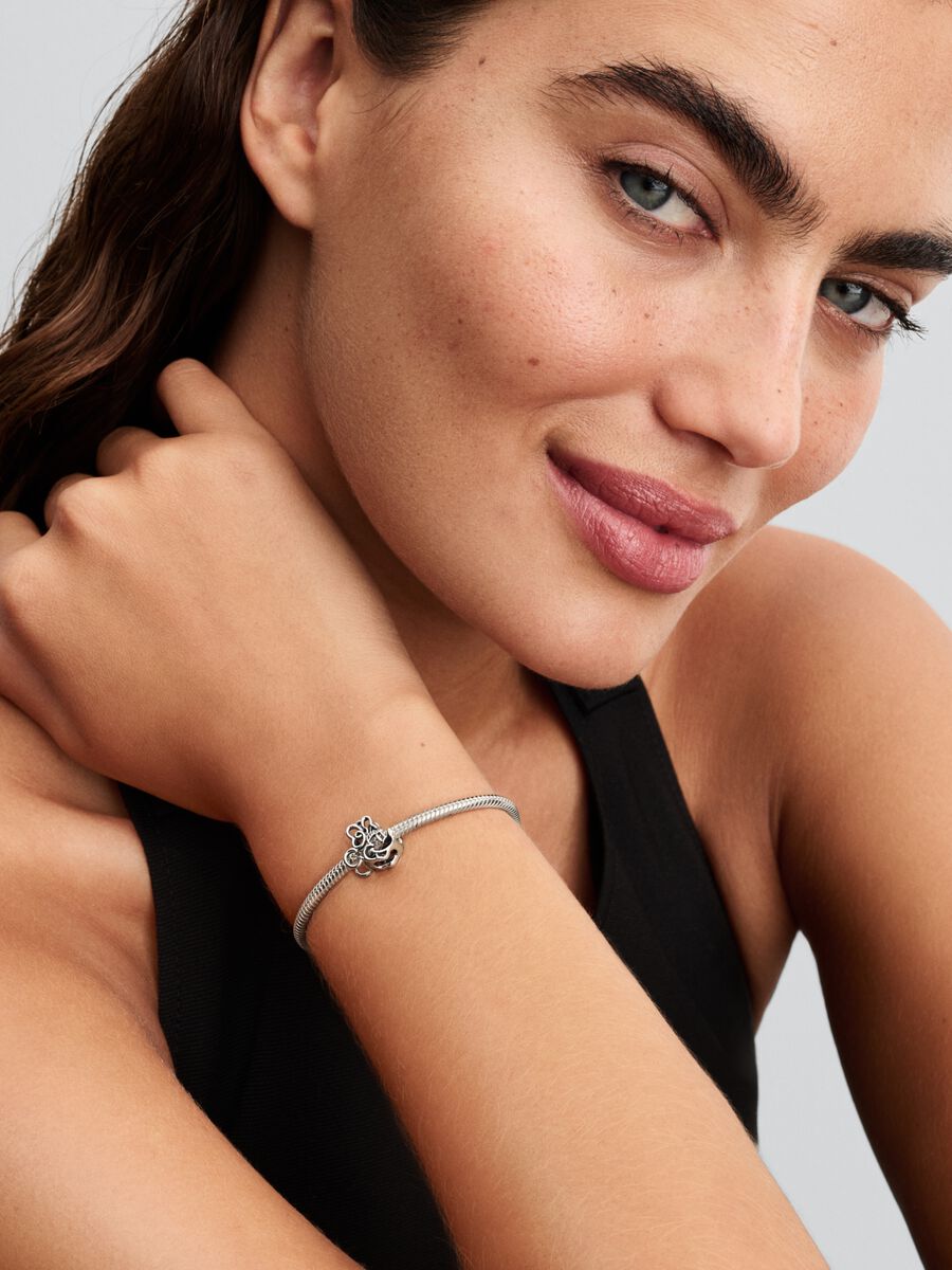 Celebrate the magic of Disney with a sterling silver charm featuring Minnie Mouse's iconic head silhouette.