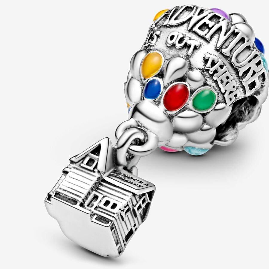 Get ready to go on a journey of a lifetime with Disney’s Up House & Balloons Charm. The colorful charm features a bundle of hand-applied enamel princess blue, light blue, mandarin orange, pale cerise, vibrant green, purple and magenta balloons carrying the sterling silver dangle house that Carl uses to go on his fantastic journey. Raised letters amongst the many colorful balloons add an inspirational touch with the statement “Adventure is out there”.